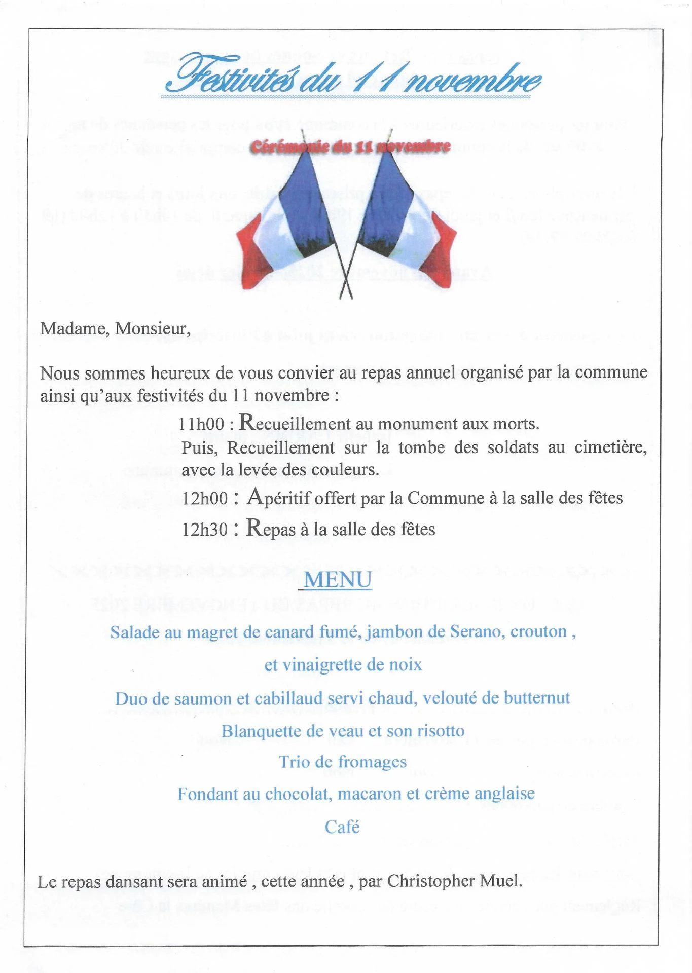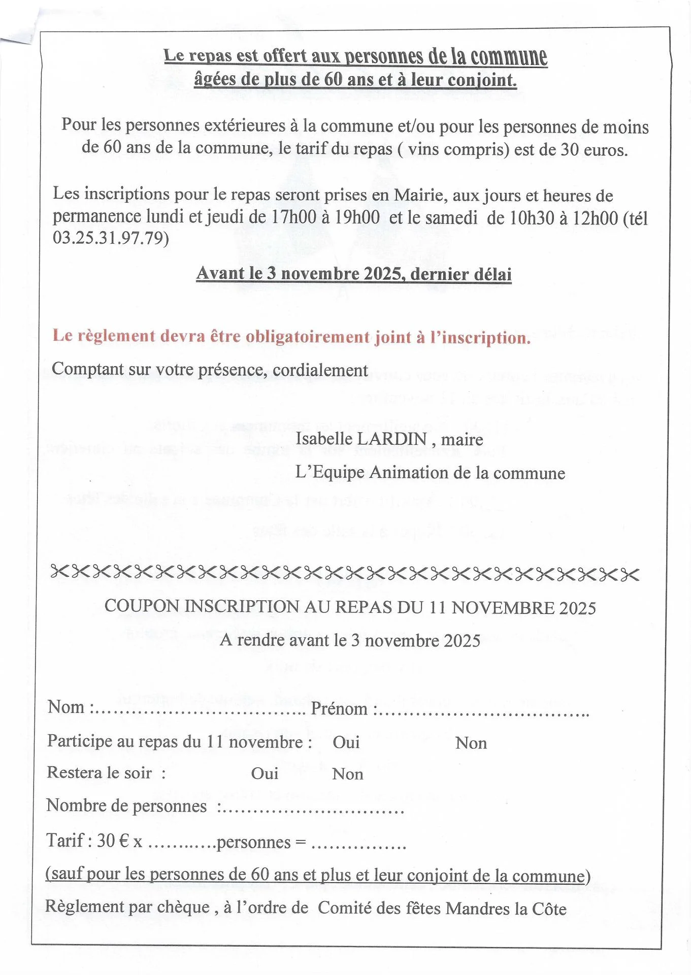 Inscription obligatoire pour le repas à rendre pour le 3 novembre au plus tard.