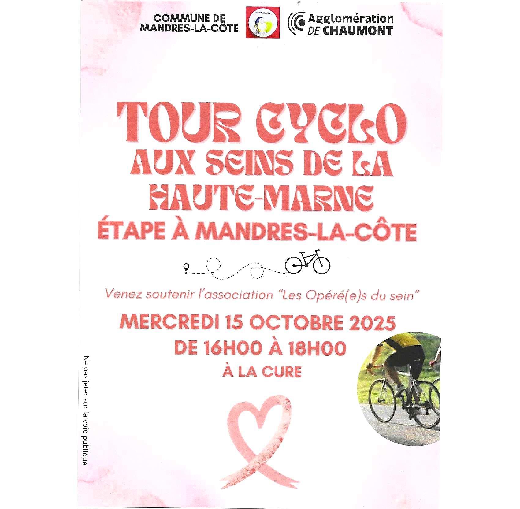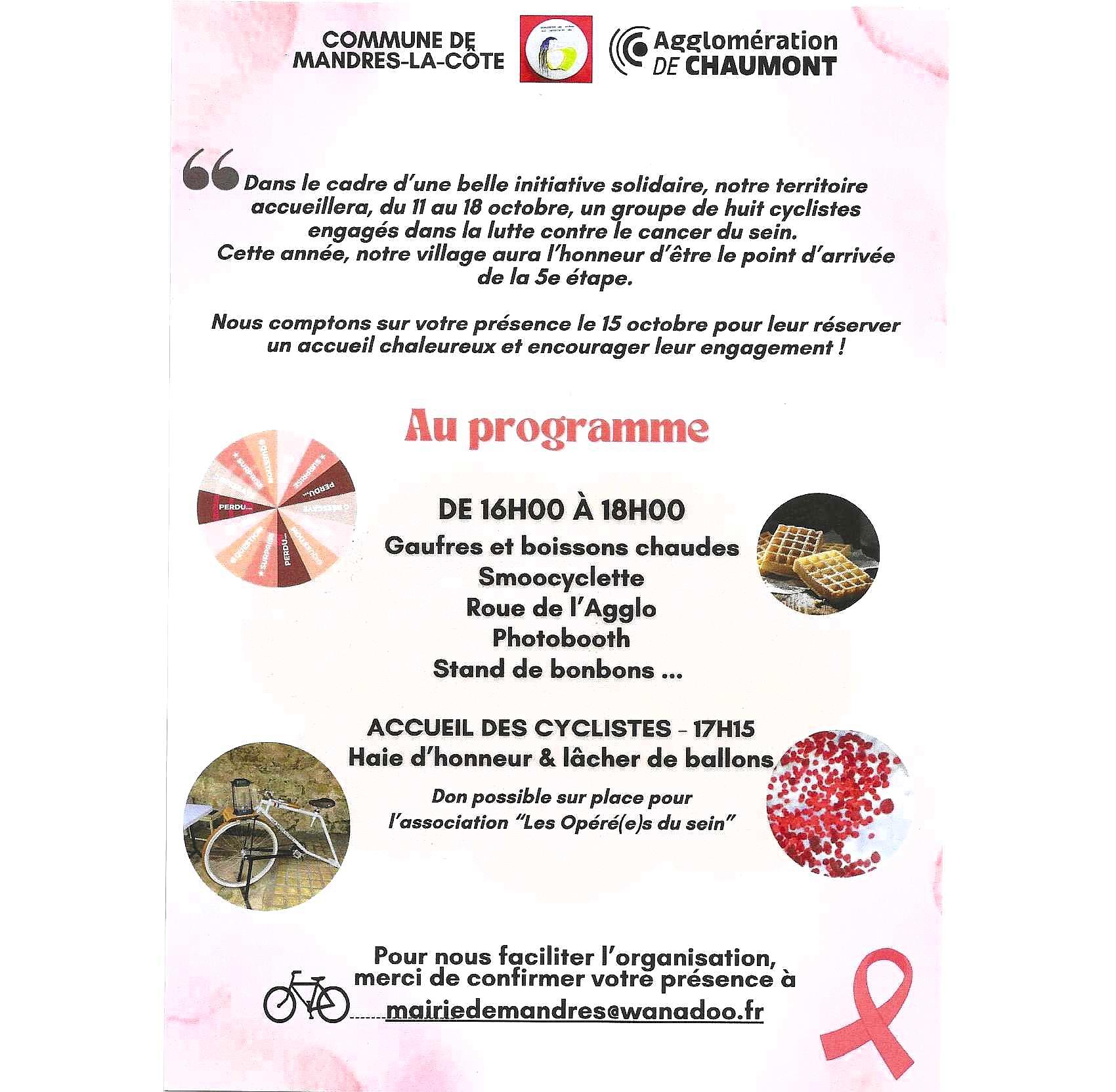 Le 15 octobre 2025, notre village aura l'honneur d'accueillir un groupe de huit cyclistes engagés dans la lutte contre le cancer du sein.